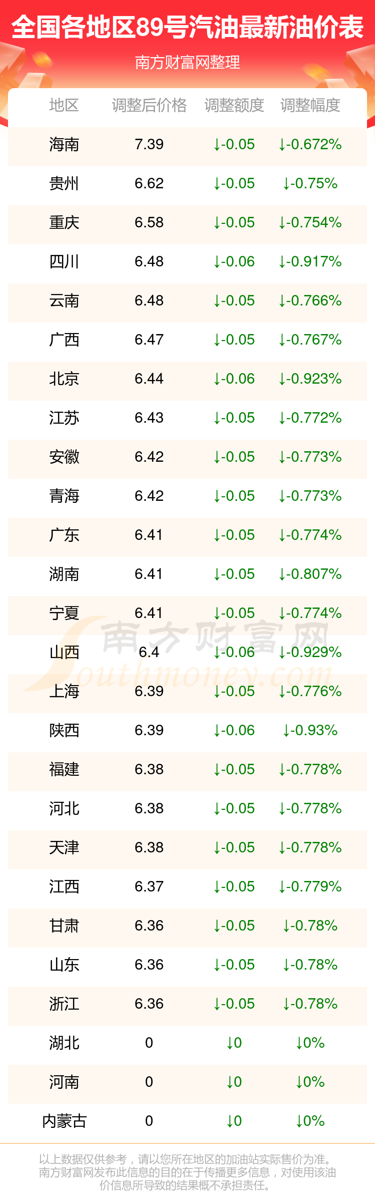 全國89號汽油11月30日最新平均價格為:6元/升,調(diào)整時間為11月25日,其中全國89號汽油最低為浙江,價格為6.36元/升,89號汽油最高為海南,價格為7.39元/升。