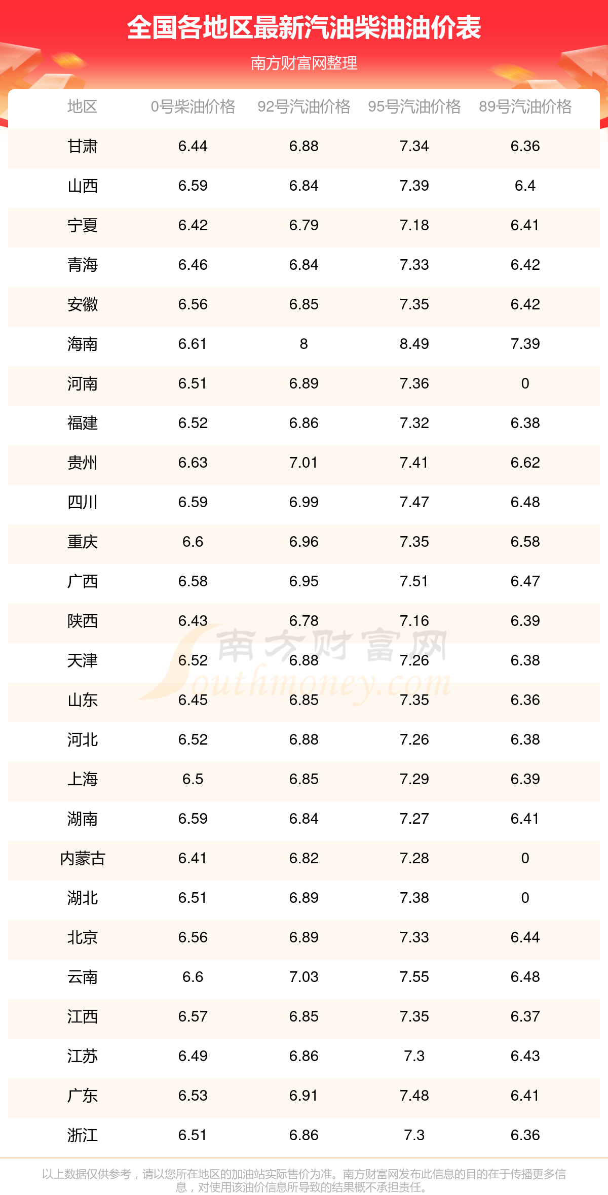 以上數(shù)據(jù)僅供參考,請(qǐng)以您所在地區(qū)的加油站實(shí)際售價(jià)為準(zhǔn)。南方財(cái)富網(wǎng)發(fā)布此信息的目的在于傳播更多信息,對(duì)使用該油價(jià)信息所導(dǎo)致的結(jié)果概不承擔(dān)責(zé)任。