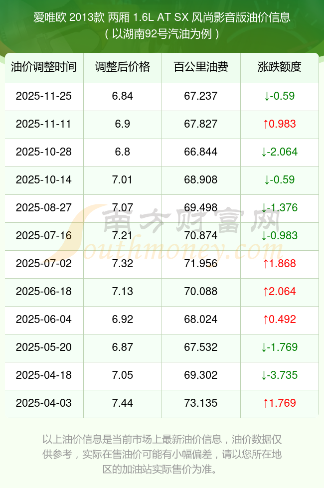 按照11月25日92號(hào)汽油最新調(diào)整價(jià)格6.84元/升來計(jì)算(以湖南為例),該車型百公里平均油費(fèi)為67.237元,按照上一輪11月11日調(diào)整價(jià)格6.9元/升來計(jì)算,百公里平均油費(fèi)為67.827元,對(duì)比上一輪少花0.59元,下一輪油價(jià)調(diào)整時(shí)間為12月8日24時(shí)。
