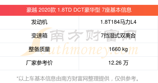 豪越 2020款 1.8TD DCT豪華型 7座動(dòng)力上配備的是一臺(tái)1.8T184馬力L4渦輪增壓發(fā)動(dòng)機(jī),匹配的是7擋濕式雙離合自動(dòng)檔變速箱,燃料形式為汽油,常規(guī)整備質(zhì)量1660kg,廠家參考價(jià)12.26萬(wàn)元。