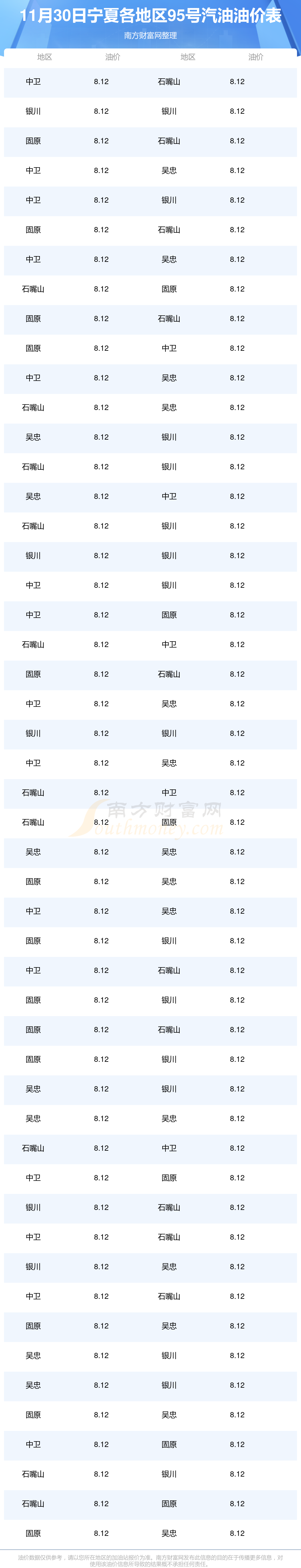 寧夏各地區(qū)最新95號汽油油價表