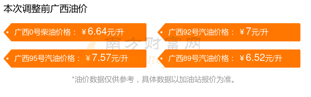 汽油價(jià)格調(diào)整最新消息:下一輪油價(jià)調(diào)整時(shí)間12月8日24時(shí)。廣西汽油、柴油11月30日每升最新價(jià)格為11月25日調(diào)整后的價(jià)格,92號(hào)汽油為6.95元,下調(diào)了0.05元;95號(hào)汽油為7.51元,下調(diào)了0.06元;89號(hào)汽油為6.47元,下調(diào)了0.05;0號(hào)柴油為6.58元,下調(diào)了0.06元。
