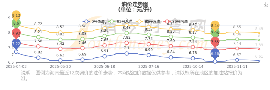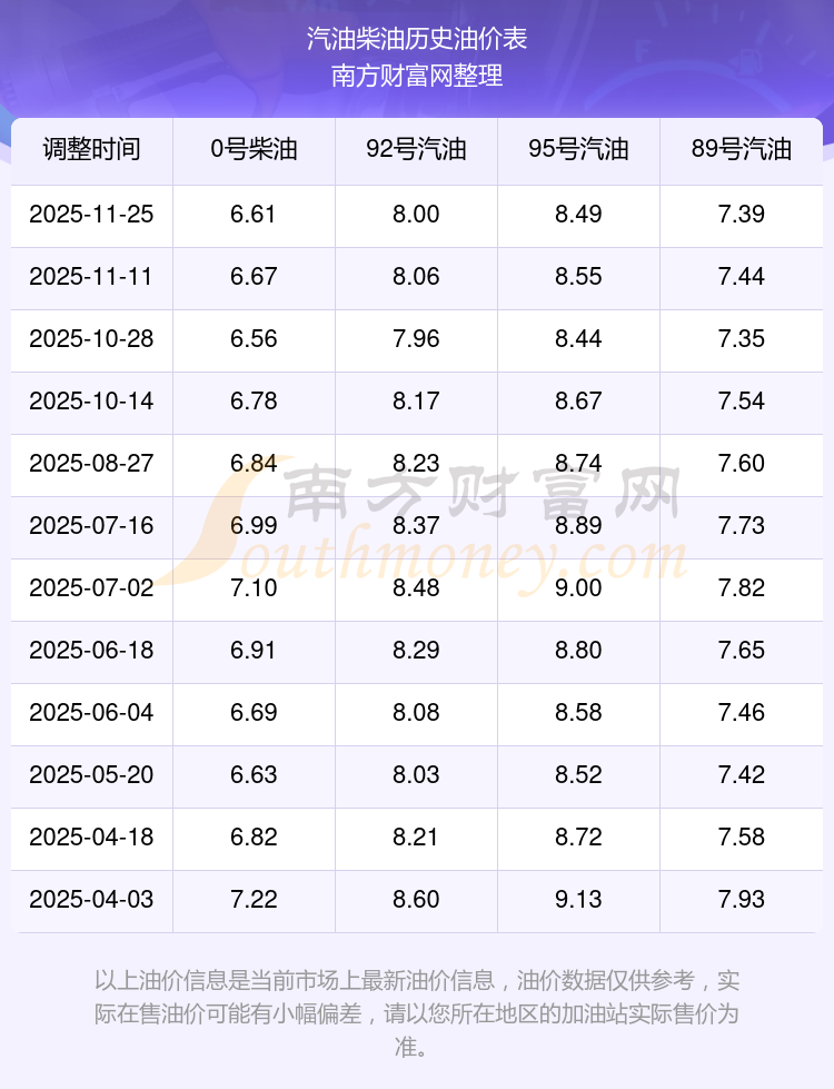 11月30日,東方92號汽油今日價格(調整時間為11月25日):8元每升,對比上次調整(11月11日)的油價8.06元每升,共下調了0.06元,下調幅達0.744%。下一輪油價調整時間12月8日24時,距離現(xiàn)在還有8.12天。