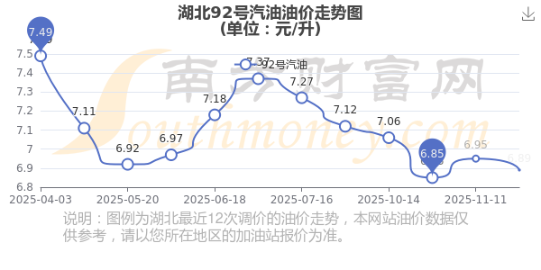 11月30日,湖北92號(hào)汽油的價(jià)格是6.89元每升,本次的調(diào)整時(shí)間為11月25日,對(duì)比上次的調(diào)整下跌了0.06元,下跌0.863%,下次調(diào)整時(shí)間為12月8日24時(shí),還有8.12天。