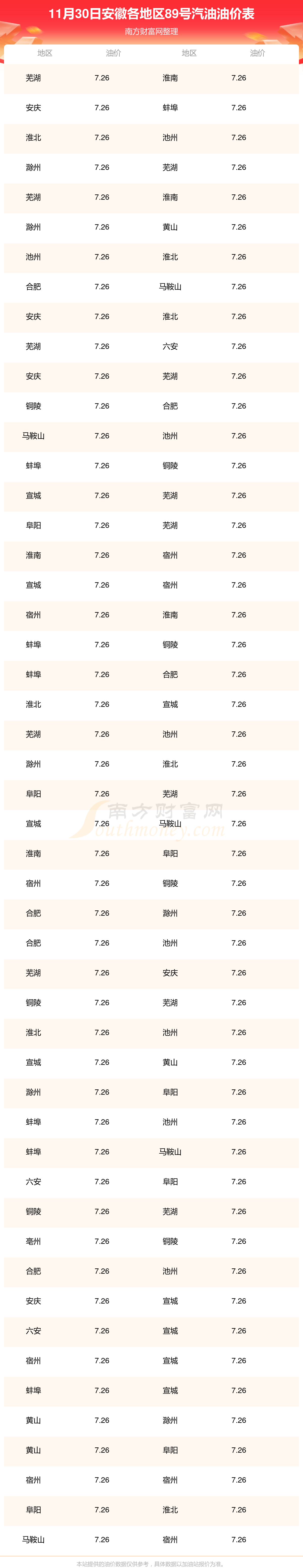 11月30日,安徽89號汽油的最新油價是6.42元/升,本輪調(diào)整時間是11月25日,相對上次油價調(diào)整共減了0.05元。
