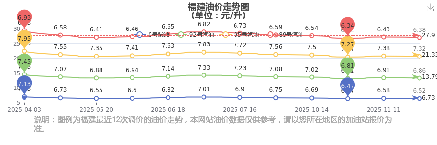 11月30日福建汽油、柴油每升的價格為11月25日調(diào)整后的價格,92號汽油為6.86元,降了0.05元,降幅達0.72%;95號汽油為7.32元,降了0.06元,降幅達0.81%;89號汽油為6.38元,降了0.05元,降幅達0.78%;0號柴油為6.52元,降了0.06元,降幅達0.91%。