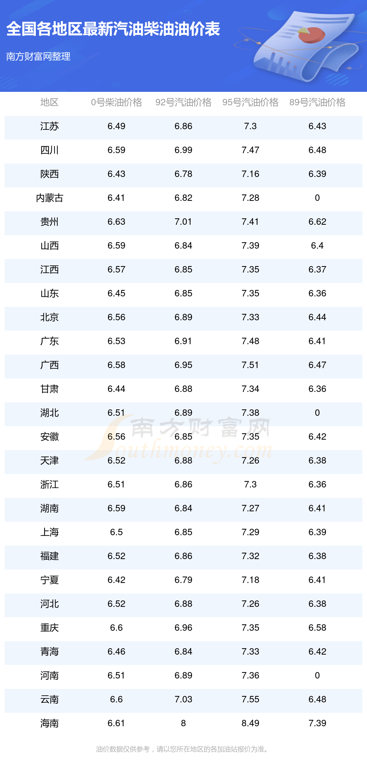 以上數(shù)據(jù)僅供參考,請(qǐng)以您所在地區(qū)的加油站實(shí)際售價(jià)為準(zhǔn)。南方財(cái)富網(wǎng)發(fā)布此信息的目的在于傳播更多信息,對(duì)使用該油價(jià)信息所導(dǎo)致的結(jié)果概不承擔(dān)責(zé)任。