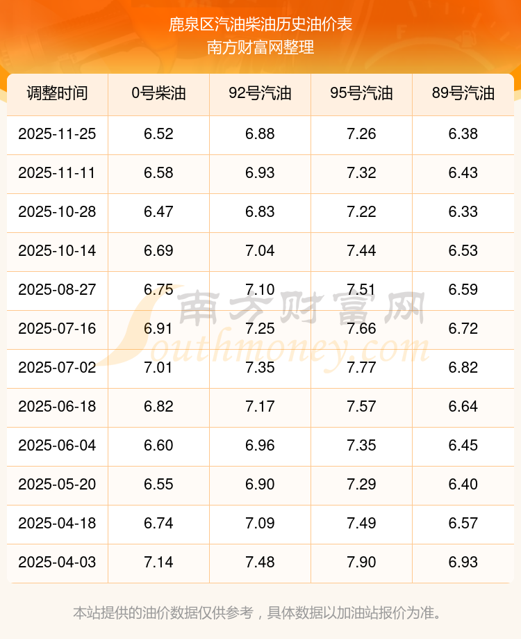 11月30日,鹿泉區(qū)汽油、柴油每升的價格為11月25日調(diào)整后的價格,具體為:92號汽油為6.88元,下降了0.05元,下降幅達0.72%;95號汽油為7.26元,下降了0.06元,下降幅達0.82%;89號汽油為6.38元,下降了0.05元,下降幅達0.78%;0號柴油為6.52元,下降了0.06元,下降幅達0.91%。