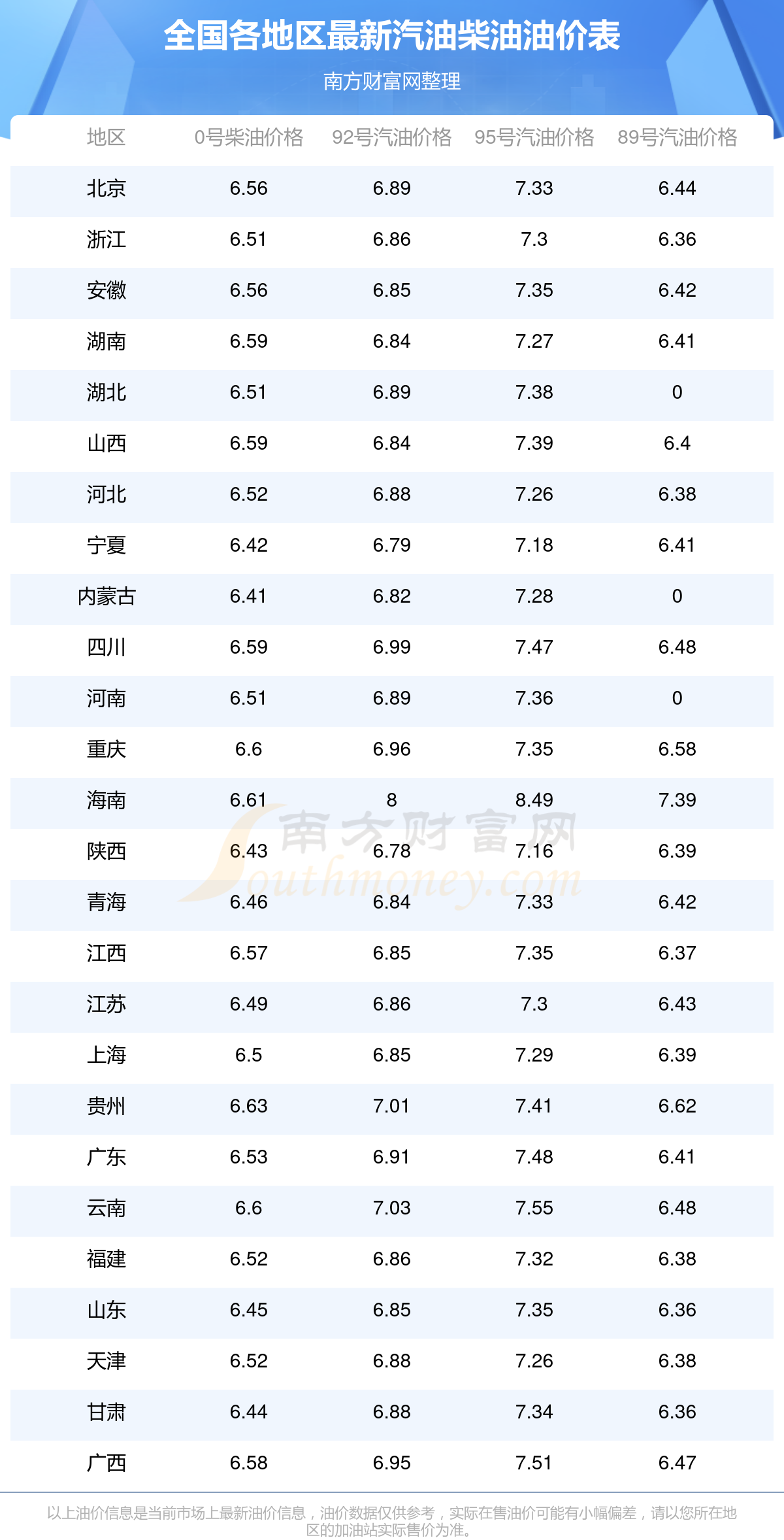 以上數(shù)據(jù)僅供參考,請(qǐng)以您所在地區(qū)的加油站實(shí)際售價(jià)為準(zhǔn)。南方財(cái)富網(wǎng)發(fā)布此信息的目的在于傳播更多信息,對(duì)使用該油價(jià)信息所導(dǎo)致的結(jié)果概不承擔(dān)責(zé)任。