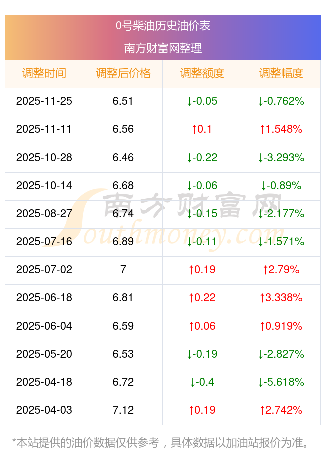 油價調(diào)整最新消息:下一輪油價調(diào)整時間12月8日24時。河南汽油、柴油11月30日每升最新價格為:調(diào)整時間為11月25日,92號汽油為6.89元,跌了0.06元;95號汽油為7.36元,跌了0.06元;0號柴油為6.51元,跌了0.05元。