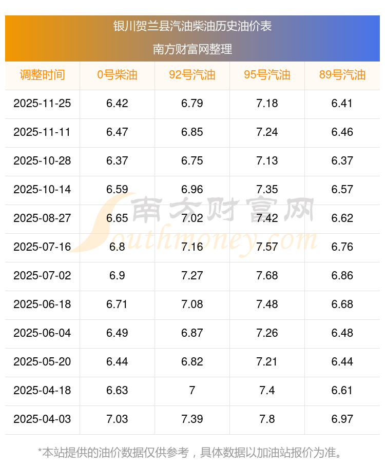 11月30日,銀川賀蘭縣汽油、柴油每升最新價(jià)格:調(diào)整時(shí)間為11月25日,92號(hào)汽油為6.79元,降了0.06元,降幅達(dá)0.88%;95號(hào)汽油為7.18元,降了0.06元,降幅達(dá)0.83%;89號(hào)汽油為6.41元,降了0.05元,降幅達(dá)0.77%;0號(hào)柴油為6.42元,降了0.05元,降幅達(dá)0.77%。