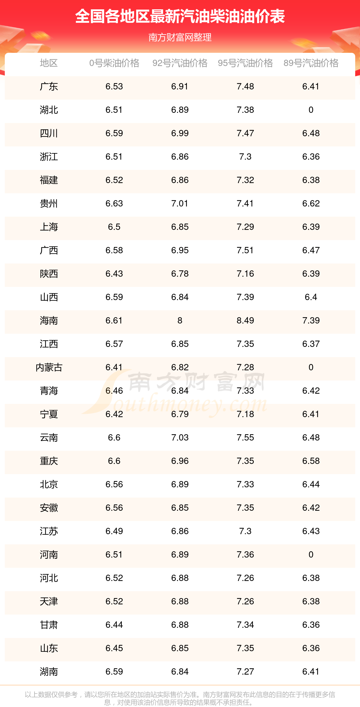 全國各地區(qū)2025年最新汽油價(jià)格表