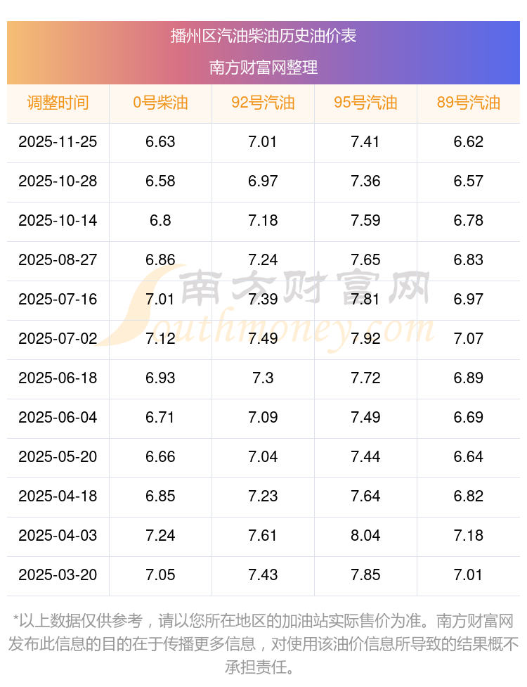 11月30日,播州區(qū)汽油、柴油每升的價(jià)格為11月25日調(diào)整后的價(jià)格,具體為:92號(hào)汽油為7.01元,下跌了0.06元,下跌幅達(dá)0.85%;95號(hào)汽油為7.41元,下跌了0.06元,下跌幅達(dá)0.8%;89號(hào)汽油為6.62元,下跌了0.05元,下跌幅達(dá)0.75%;0號(hào)柴油為6.63元,下跌了0.06元,下跌幅達(dá)0.9%。