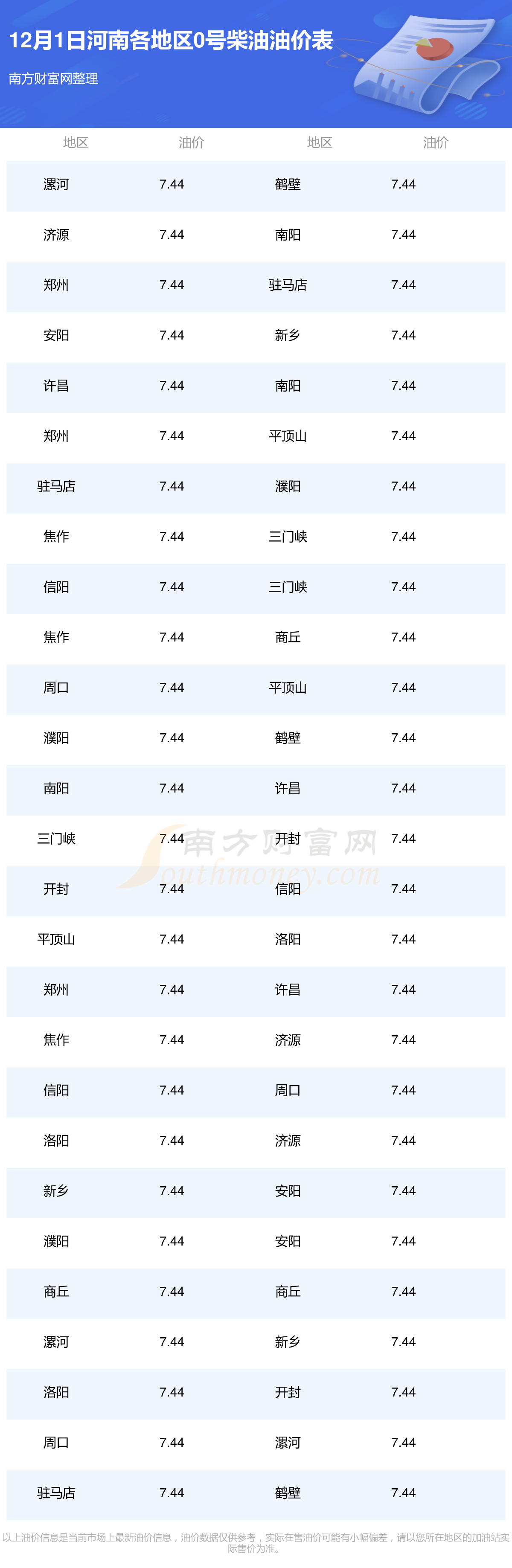 河南各地區(qū)最新0號(hào)柴油油價(jià)表