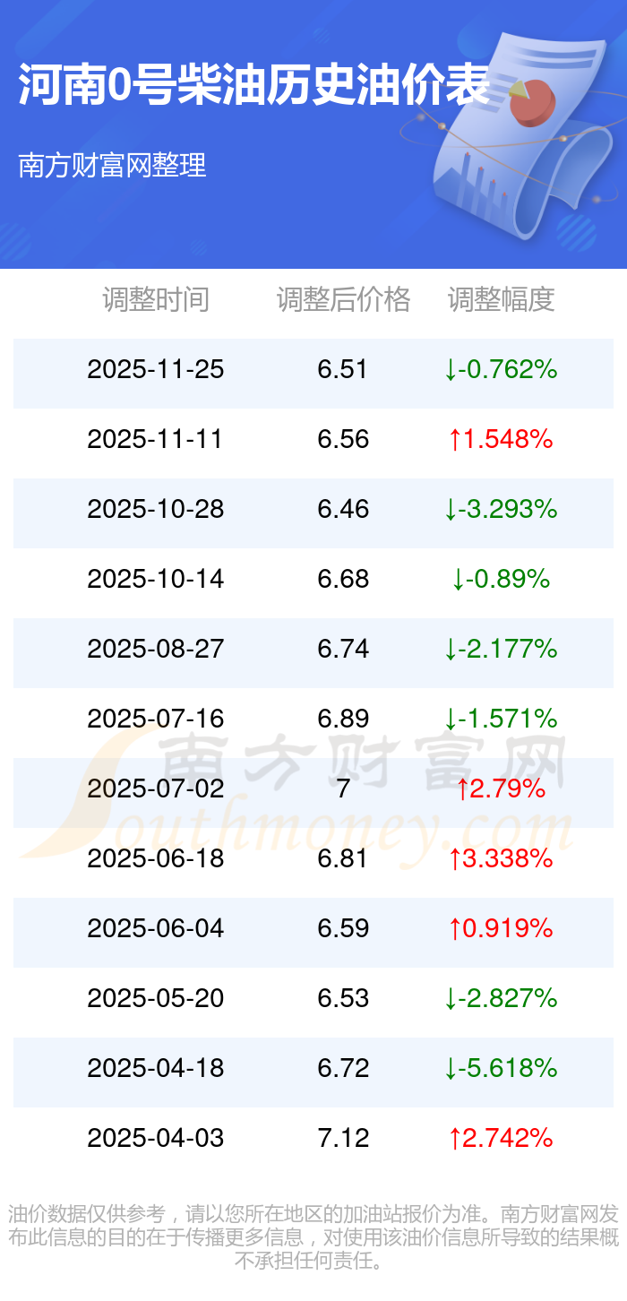 12月1日河南0號(hào)柴油的價(jià)格是11月25日調(diào)整后的價(jià)格,具體價(jià)格是6.51元每升,對(duì)比上輪調(diào)整共減了0.05元,減0.762%。