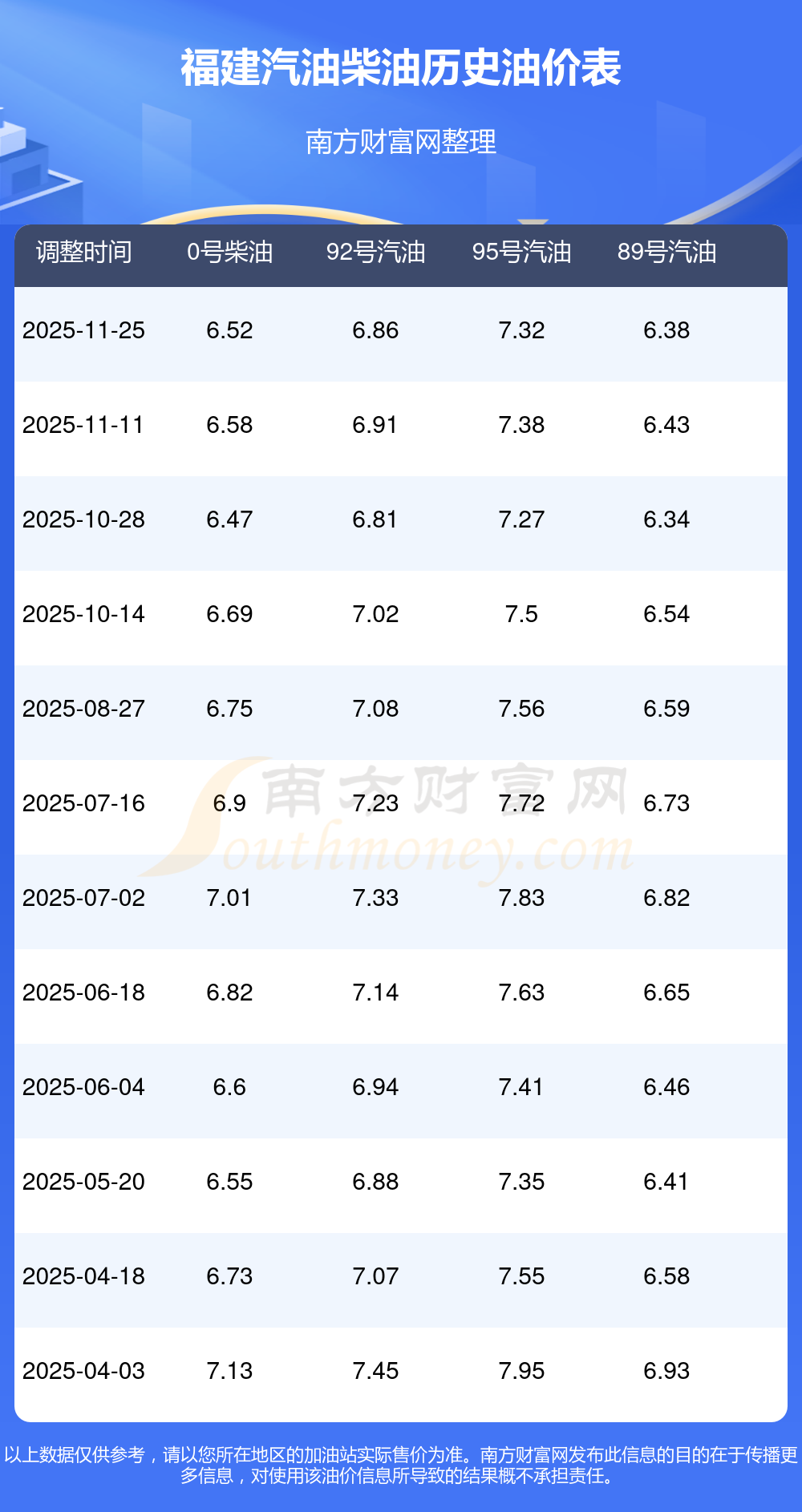 福建汽油、柴油12月1日每升最新價格為11月25日調(diào)整后的價格,92號汽油為6.86元,減了0.05元;95號汽油為7.32元,減了0.06元;89號汽油為6.38元,減了0.05;0號柴油為6.52元,減了0.06元。