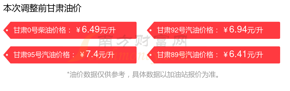 12月1日甘肅汽油、柴油每升最新價(jià)格多少錢一升?具體為:92號汽油6.88元,跌了0.06元;95號汽油7.34元,跌了0.06元;89號汽油6.36元,跌了0.05;0號柴油為6.44元,跌了0.05元,本次的調(diào)整時(shí)間是11月25日。