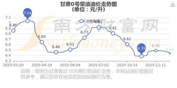 12月1日,甘肅0號(hào)柴油的價(jià)格是6.44元每升,本次的調(diào)整時(shí)間為11月25日,對(duì)比上次的調(diào)整減了0.05元,減0.77%,下次調(diào)整時(shí)間為12月8日24時(shí),還有7.81天。