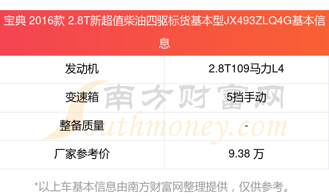 在動(dòng)力方面,寶典 2016款 2.8T新超值柴油四驅(qū)標(biāo)貨基本型JX493ZLQ4G搭載的是一臺(tái)2.8T109馬力L4渦輪增壓發(fā)動(dòng)機(jī),匹配5擋手動(dòng)擋變速箱,燃料形式為柴油,廠家參考價(jià)9.38萬(wàn)元。