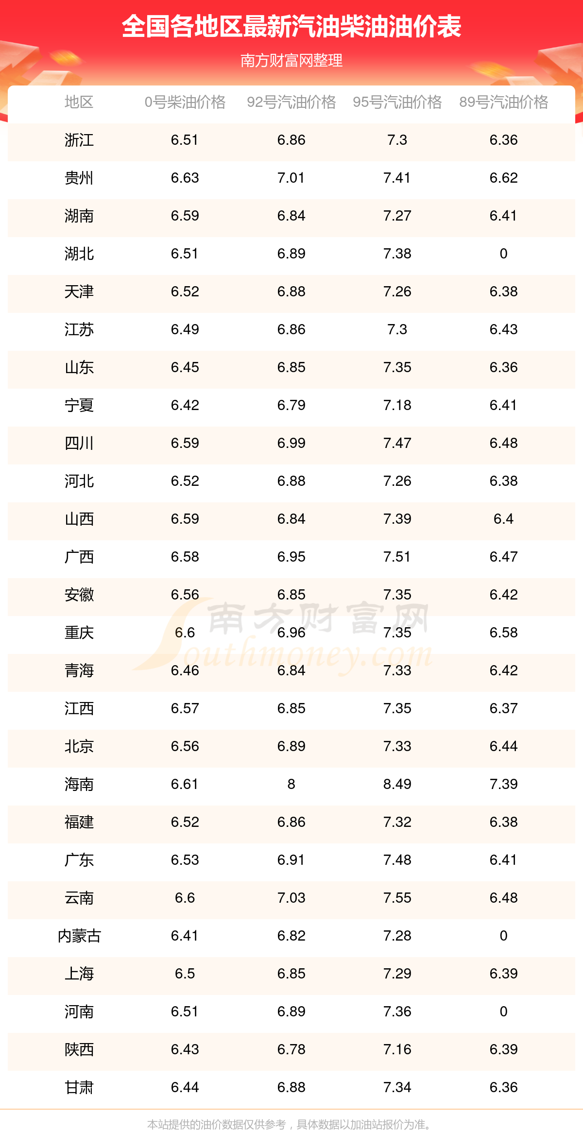 油價(jià)數(shù)據(jù)僅供參考,請(qǐng)以您所在地區(qū)的加油站報(bào)價(jià)為準(zhǔn)。南方財(cái)富網(wǎng)發(fā)布此信息的目的在于傳播更多信息,對(duì)使用該油價(jià)信息所導(dǎo)致的結(jié)果概不承擔(dān)任何責(zé)任。
