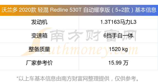 沃蘭多 2020款 輕混 Redline 530T 自動(dòng)??享版(5+2款)搭載了一臺(tái)1.3T163馬力L3渦輪增壓發(fā)動(dòng)機(jī),采用6擋手自一體自動(dòng)檔變速箱,常規(guī)整備質(zhì)量1520kg,廠家參考價(jià)15.99萬(wàn)元。