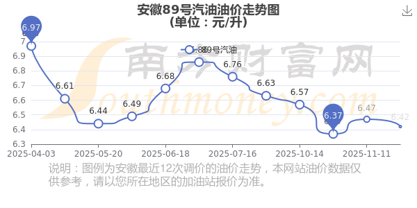12月1日,安徽89號(hào)汽油的價(jià)格是6.42元每升,本次的調(diào)整時(shí)間為11月25日,對(duì)比上次的調(diào)整下調(diào)了0.05元,下調(diào)0.773%,12月8日24時(shí)為下一輪油價(jià)調(diào)整時(shí)間,還有7.75天。