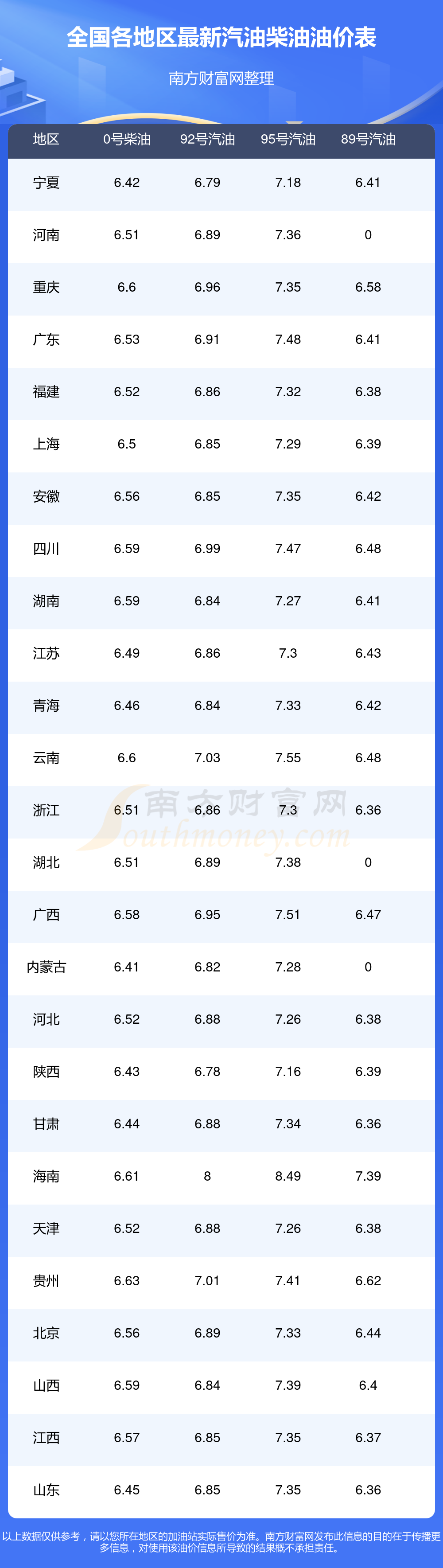 油價調(diào)整最新消息:油價最新調(diào)整時間為11月25日,全國92號汽油最新平均價格為:7元每升,其中,最低為陜西,價格為6.78元/升,最高為海南,價格為8.00元/升。全國95號汽油最新平均價格為:7元每升,其中,最低為陜西,價格為7.16元/升,最高為海南,價格為8.49元/升。全國0號柴油最新平均價格為:7元每升,其中,最低為內(nèi)蒙古,價格為6.41元/升,最高為貴州,價格為6.63元/升。全國89號汽油最新平均價格為:6元每升,其中,最低為浙江,價格為6.36元/升,最高為海南,價格為7.39元/升。下一輪汽油價格調(diào)整時間12月8日24時,距離現(xiàn)在還有7.75天。