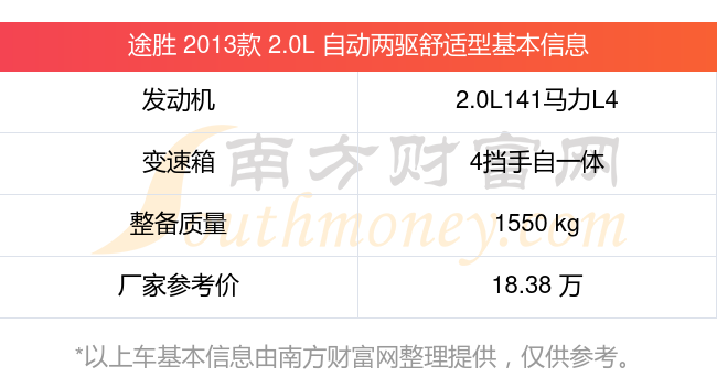 途勝 2013款 2.0L 自動(dòng)兩驅(qū)舒適型動(dòng)力方面,搭載的是一臺(tái)2.0L141馬力L4自然吸氣發(fā)動(dòng)機(jī),匹配4擋手自一體自動(dòng)檔變速箱,燃料形式為汽油,常規(guī)整備質(zhì)量1550kg,廠家參考價(jià)18.38萬(wàn)元。