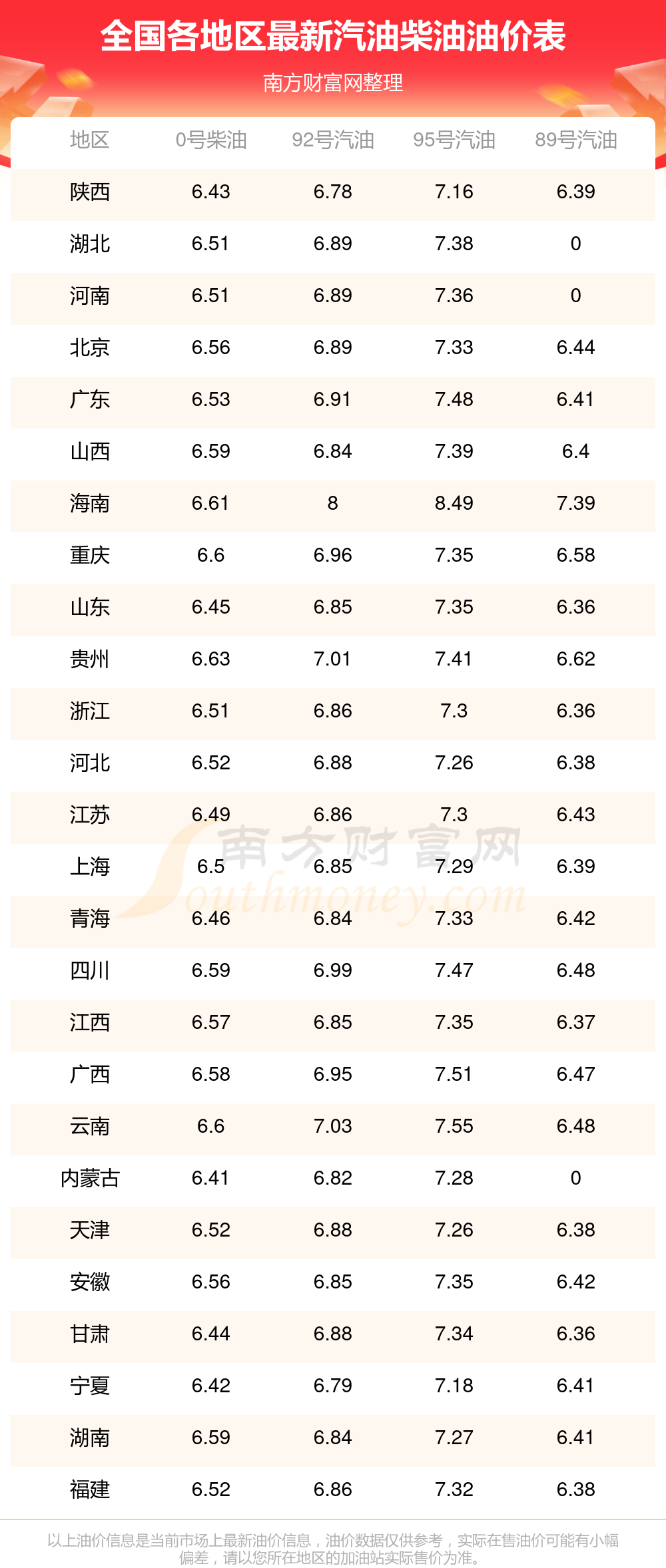 全國95號汽油平均價格為:7元每升,其中,最低為陜西,價格7.16元/升,最高為海南,價格8.49元/升。