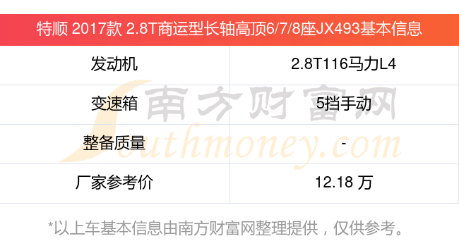 特順 2017款 2.8T商運(yùn)型長(zhǎng)軸高頂6/7/8座JX493動(dòng)力上搭載的是一臺(tái)2.8T116馬力L4渦輪增壓發(fā)動(dòng)機(jī),匹配5擋手動(dòng)擋變速箱,燃料形式為柴油,廠家參考價(jià)12.18萬(wàn)元。
