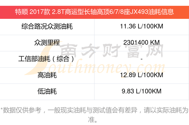根據(jù)多位車主實(shí)測(cè)得出數(shù)據(jù),該車型低油耗為9.83L/100km,高油耗為12.89L/100km,綜合路況眾測(cè)油耗為11.36L/100km,工信部綜合油耗為-L/100km。