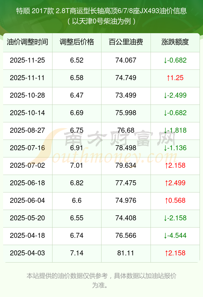按11月25日0號(hào)柴油最新調(diào)整價(jià)格6.52元每升來(lái)計(jì)算(以天津?yàn)槔?,該車型百公里平均油費(fèi)為74.067元,按上一輪11月11日調(diào)整價(jià)格6.58元每升來(lái)計(jì)算,百公里平均油費(fèi)為74.749元,對(duì)比上一輪少花0.682元,下一輪油價(jià)調(diào)整時(shí)間為12月8日24時(shí)。