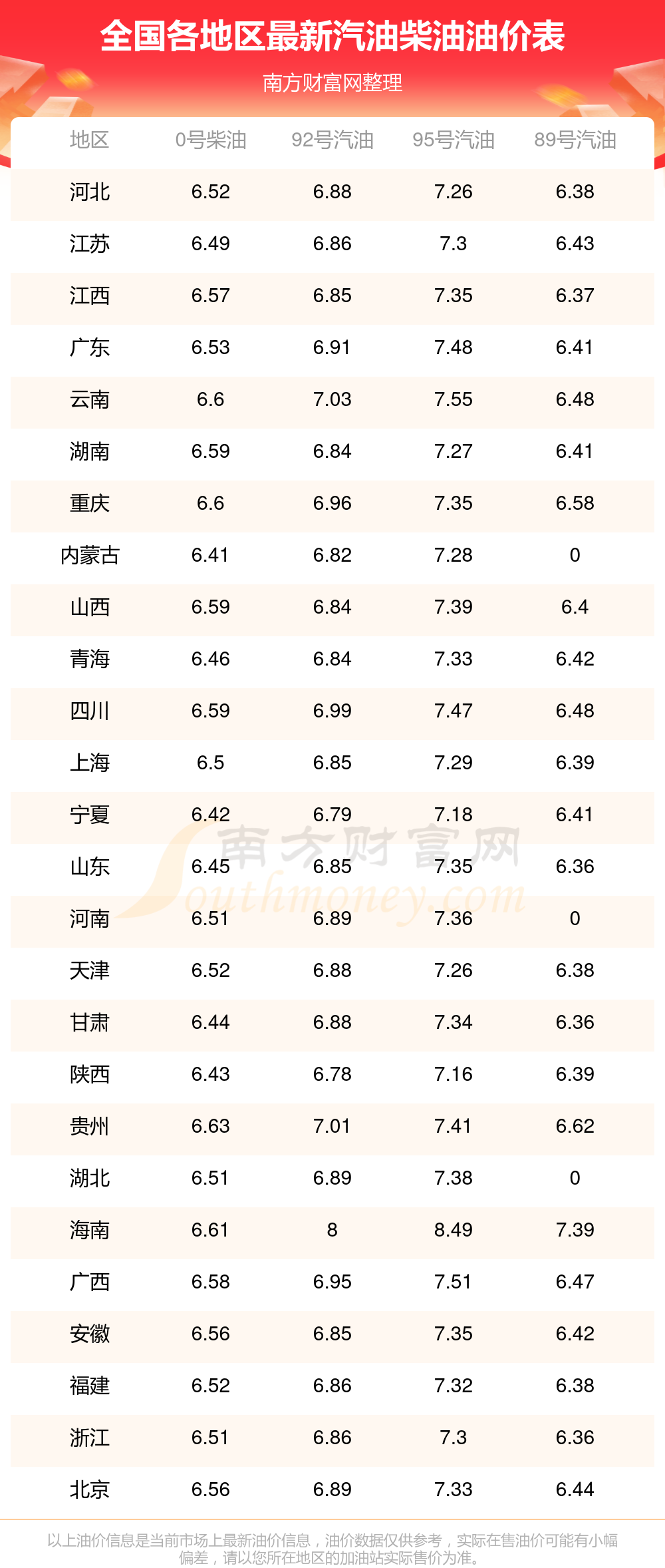 2025年12月1日全國(guó)各地汽油價(jià)格表一覽