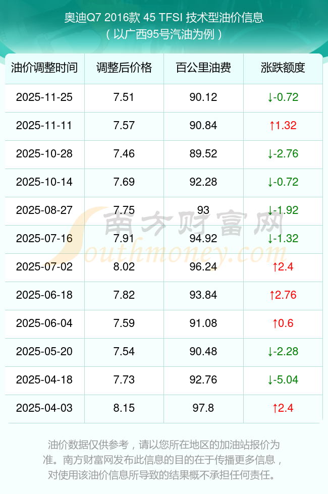 按11月25日95號汽油最新調(diào)整價格7.51元每升來計算(以廣西為例),該車型百公里平均油費為90.12元,按上一輪11月11日調(diào)整價格7.57元每升來計算,百公里平均油費為90.84元,對比上一輪少花0.72元,下一輪油價調(diào)整時間為12月8日24時。