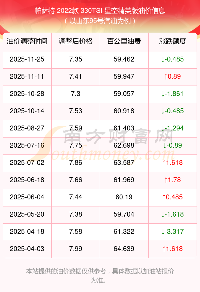 按照11月25日95號汽油最新調整價格7.35元/升來計算(以山東為例),該車型百公里平均油費為59.462元,按照上一輪11月11日調整價格7.41元/升來計算,百公里平均油費為59.947元,對比上一輪少花0.485元,下一輪油價調整時間為12月8日24時。