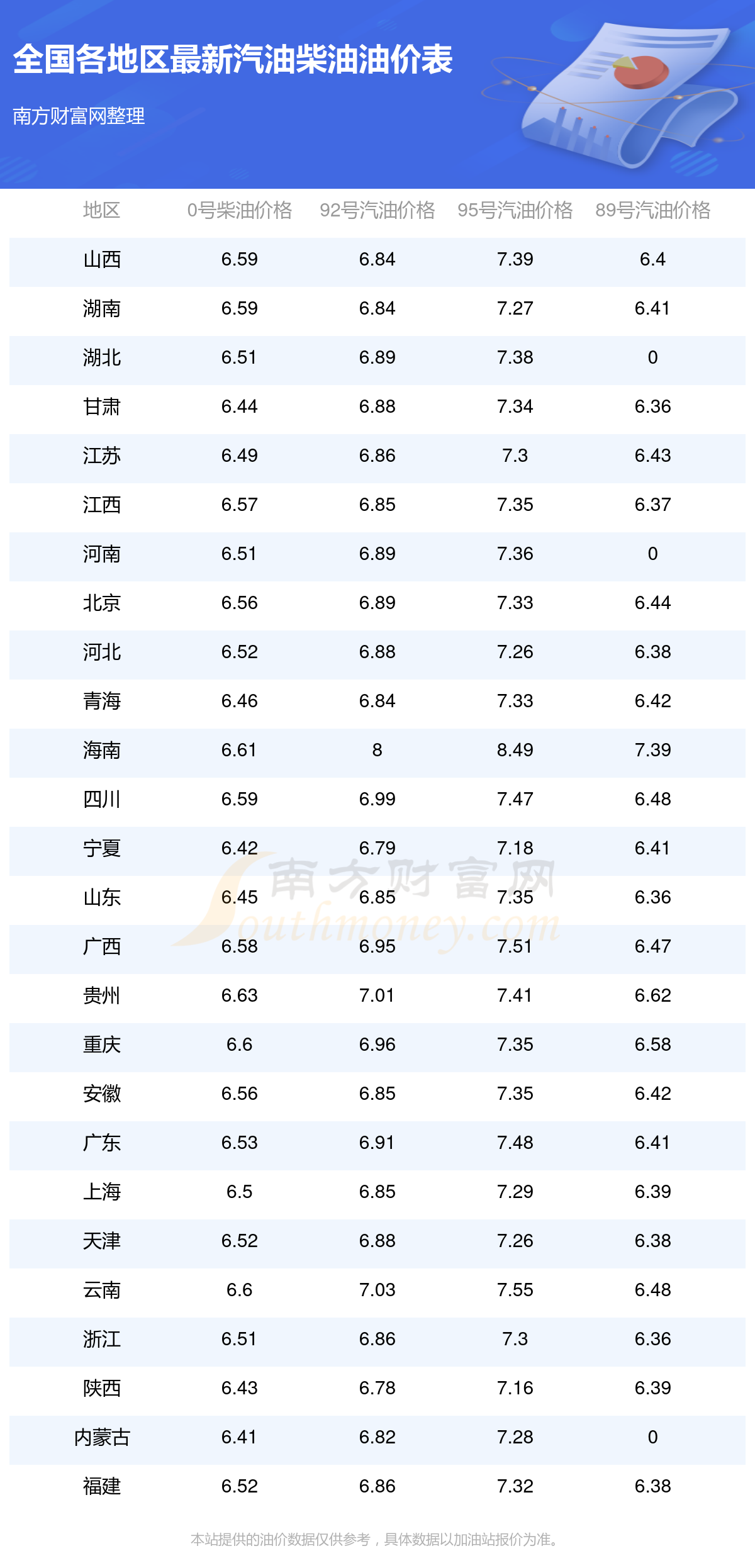 以上數(shù)據(jù)僅供參考,請以您所在地區(qū)的加油站實際售價為準(zhǔn)。南方財富網(wǎng)發(fā)布此信息的目的在于傳播更多信息,對使用該油價信息所導(dǎo)致的結(jié)果概不承擔(dān)責(zé)任。