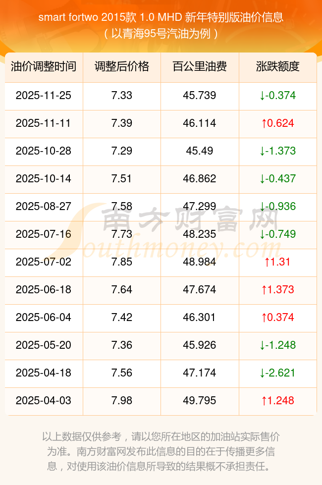 依照11月25日95號(hào)汽油最新調(diào)整價(jià)格7.33元/升來(lái)計(jì)算(以青海為例),該車型百公里的平均油費(fèi)是45.739元,依照上一輪11月11日調(diào)整價(jià)格7.39元/升來(lái)計(jì)算,百公里的平均油費(fèi)是46.114元,對(duì)比上一輪少花0.374元,下一輪的油價(jià)調(diào)整時(shí)間12月8日24時(shí)。