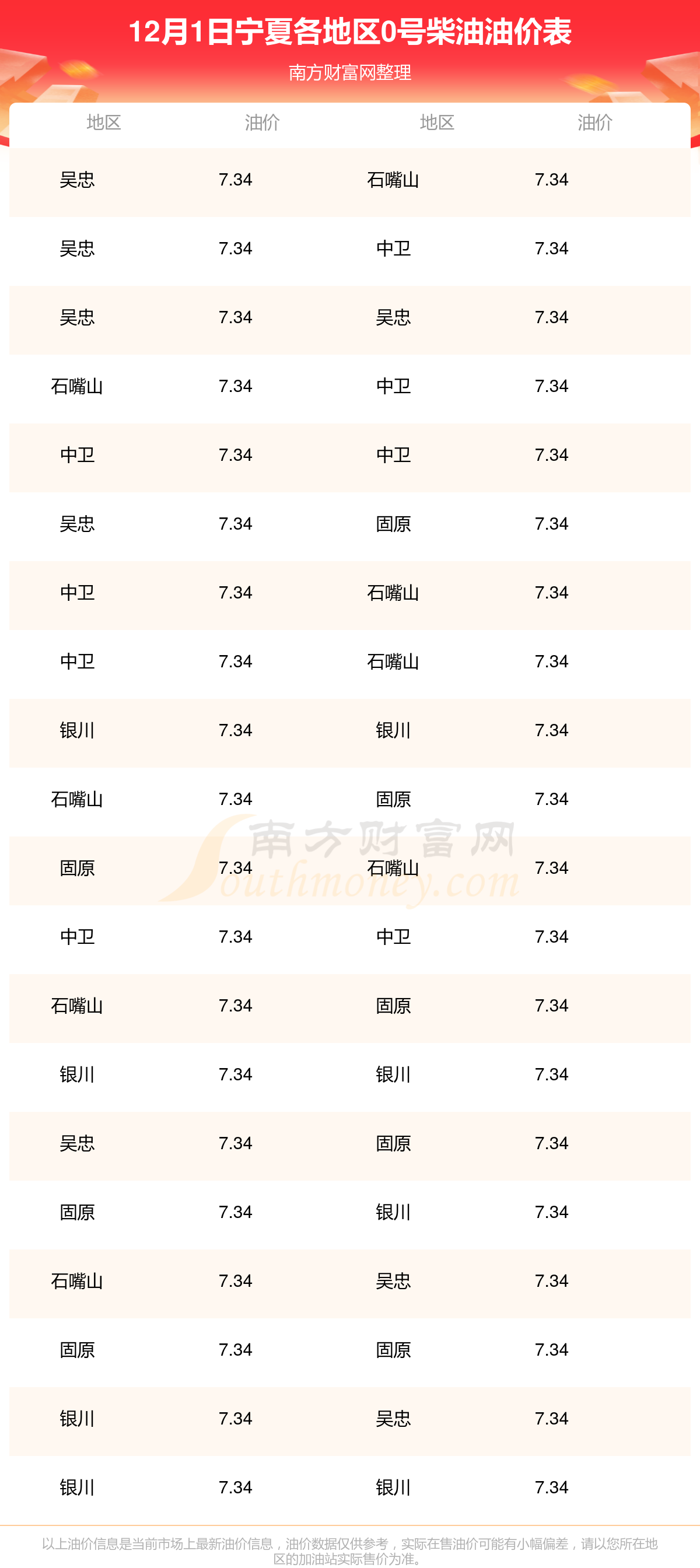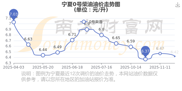 12月1日,寧夏0號柴油的最新價格為6.42元/升,本輪油價調整時間是11月25日,對比上次調整共下調了0.05元,下調0.773%。