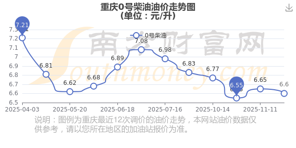 12月1日,重慶0號(hào)柴油的價(jià)格是6.6元每升,本次的調(diào)整時(shí)間為11月25日,對(duì)比上次的調(diào)整下降了0.05元,下降0.752%,下次調(diào)整時(shí)間為12月8日24時(shí),還有7.65天。