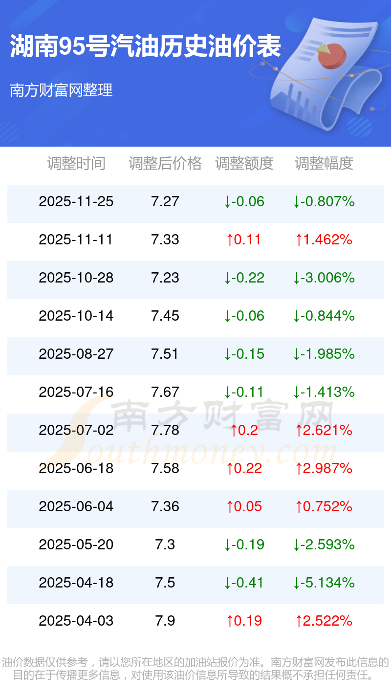 12月1日,湖南95號汽油油價(jià)是7.27元每升,這是11月25日調(diào)整后的價(jià)格,相對上一輪調(diào)整跌了0.06元,跌0.807%。