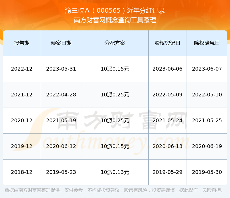 渝三峽A最新一次公布的分紅方案為10派0.15元。本次權(quán)益分派股權(quán)登記日為2023年6月6日,除權(quán)除息日為2023年6月7日,派息日為2023年6月7日。