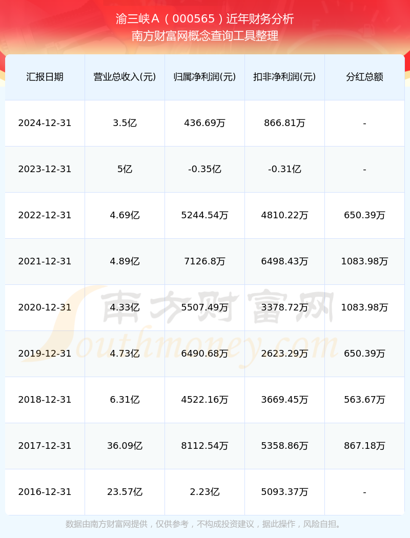2024年報顯示,渝三峽A實現(xiàn)營收3.5億,同比增長-29.94%;凈利潤436.69萬,同比增長112.54%;毛利率22.63%。