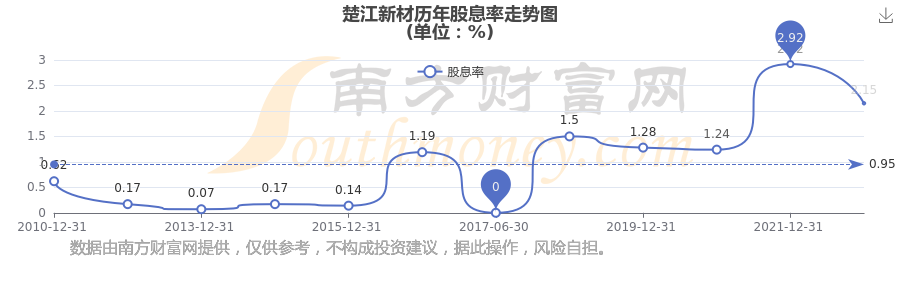 按照南方財富網(wǎng)趨勢選股系統(tǒng)統(tǒng)計,楚江新材所屬行業(yè)為銅基材料行業(yè),銅基材料行業(yè)分紅排名情況如下表: