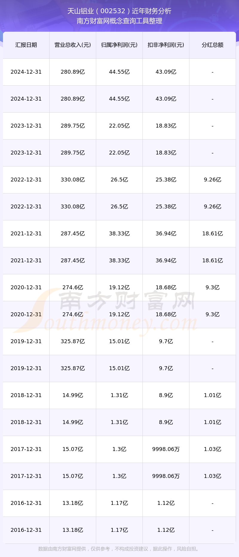 天山鋁業(yè)歷年分紅派息情況如下表所示: