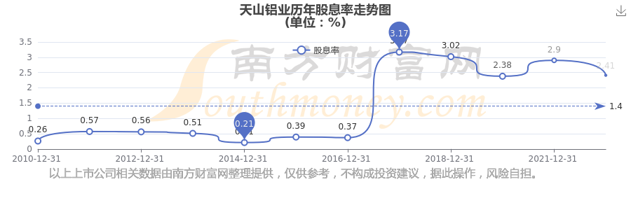 天山鋁業(yè)歷年股息率走勢(shì)如下圖: