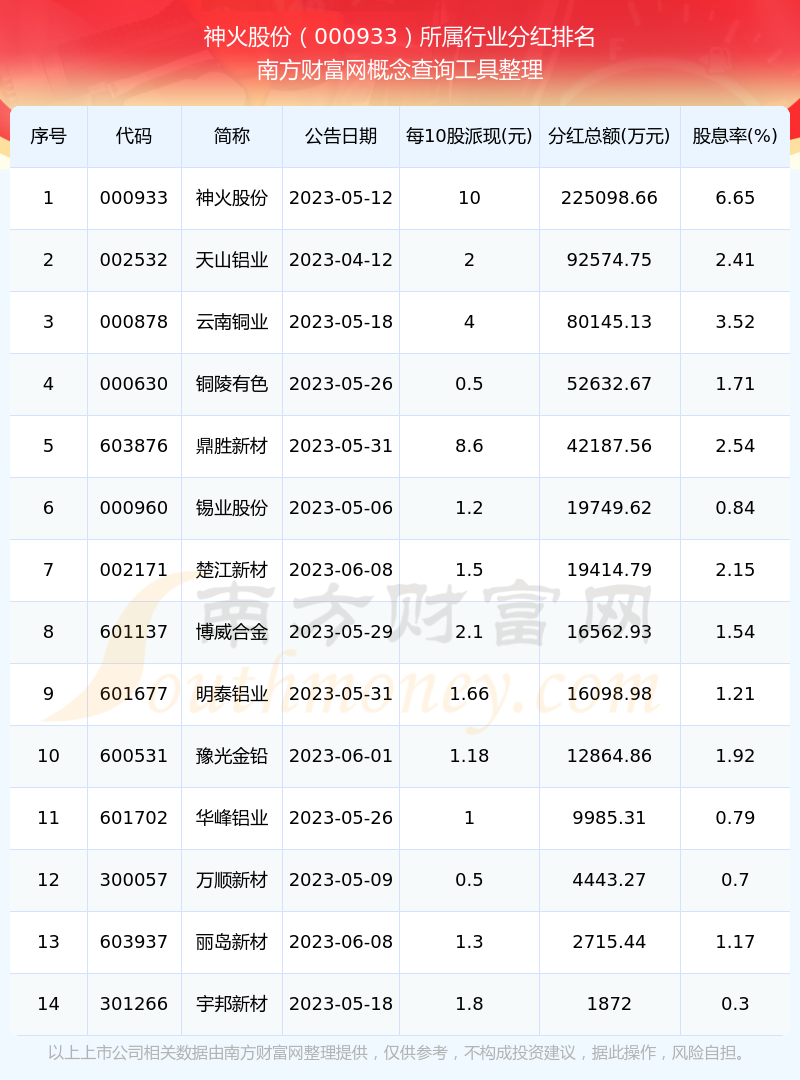 按照南方財富網(wǎng)趨勢選股系統(tǒng)統(tǒng)計,神火股份所屬行業(yè)為鋁錠行業(yè),鋁錠行業(yè)分紅排名情況如下表:
