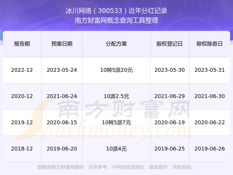 近年冰川網(wǎng)絡(luò)分紅情況如下表所示: