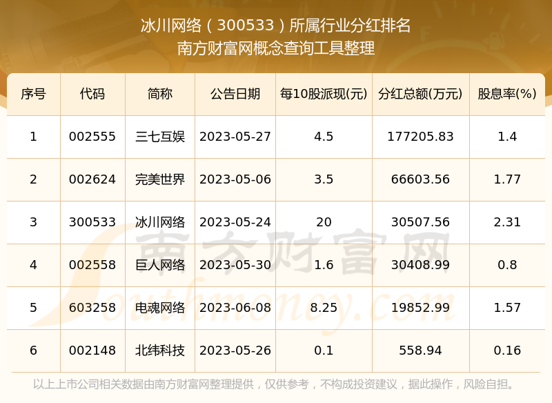 按照南方財富網(wǎng)趨勢選股系統(tǒng)統(tǒng)計,冰川網(wǎng)絡(luò)所屬行業(yè)為網(wǎng)絡(luò)游戲行業(yè),網(wǎng)絡(luò)游戲行業(yè)分紅排名情況如下表:
