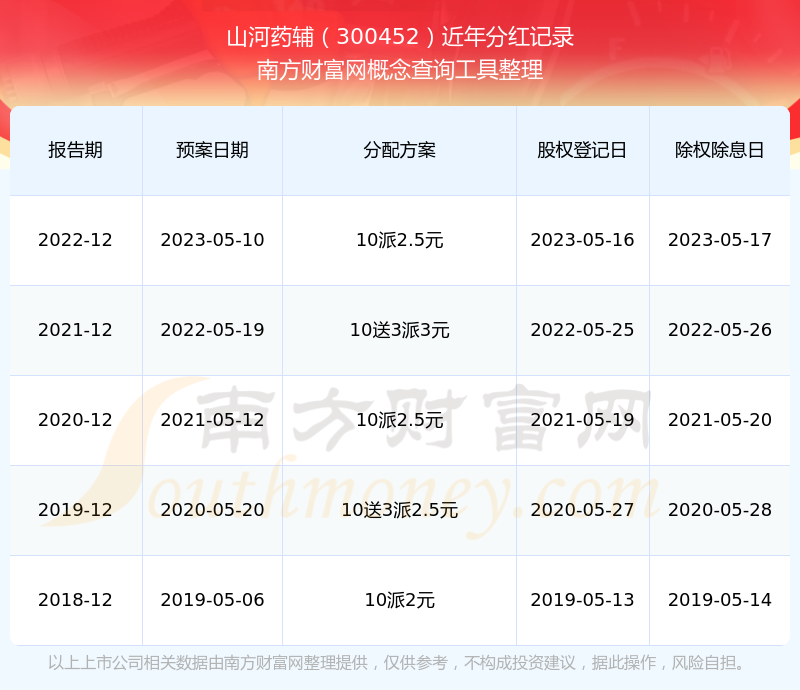 山河藥輔最新一次公布的分紅方案為10派2.5元。本次權益分派股權登記日為2023年5月16日,除權除息日為2023年5月17日,派息日為2023年5月17日。
