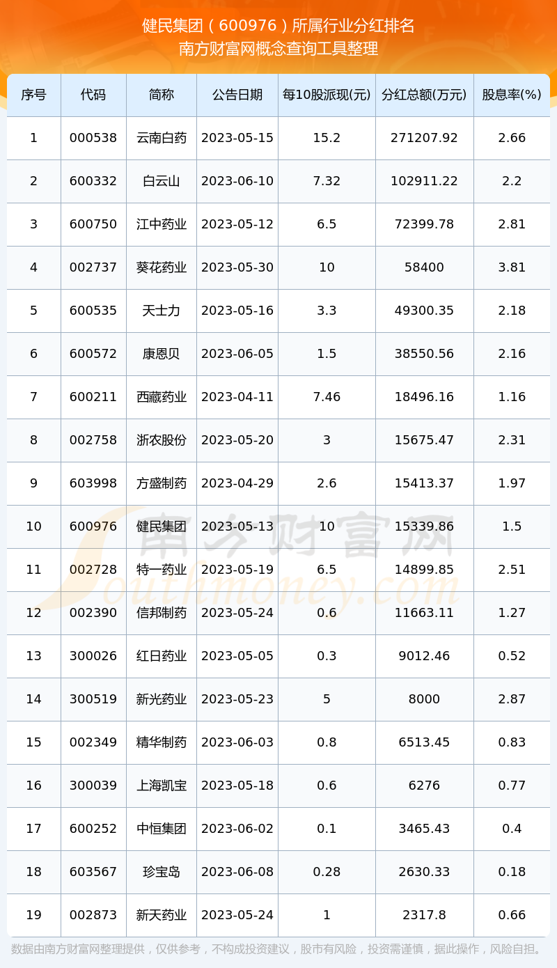 按照南方財富網(wǎng)趨勢選股系統(tǒng)統(tǒng)計,健民集團所屬行業(yè)為中藥行業(yè),中藥行業(yè)分紅排名情況如下表: